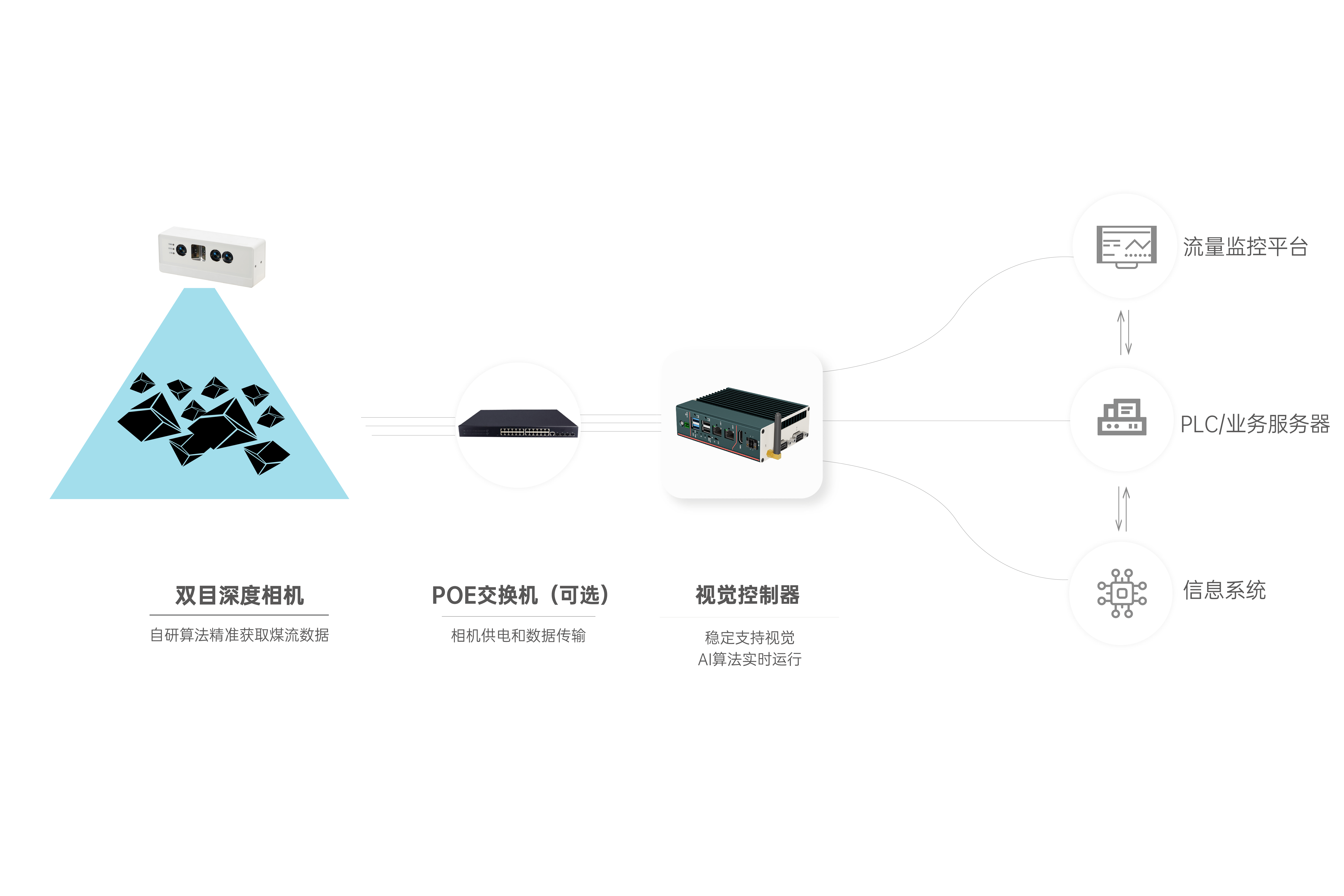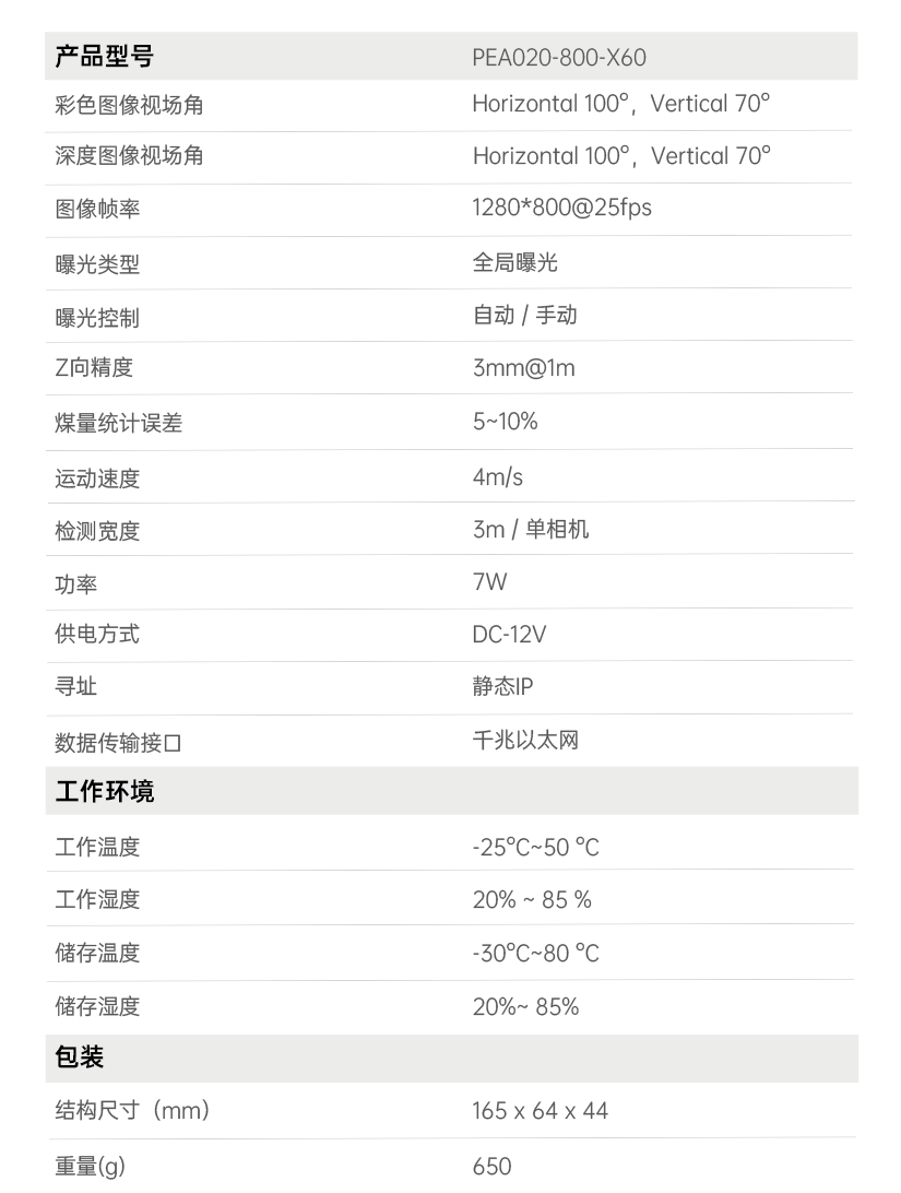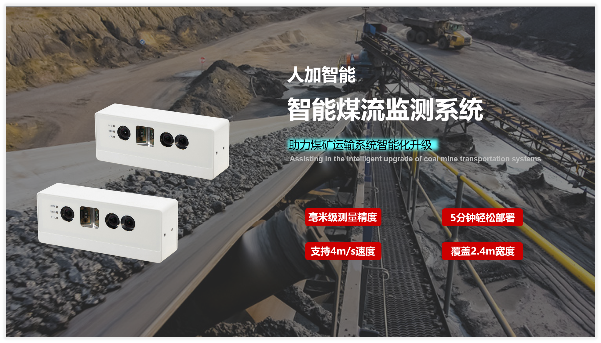 首页 动态 场景应用丨欧博ABG智能智能煤流监测系统全新升级,赋能自动化煤流管控 场景应用丨欧博ABG智能智能煤流监测系统全新升级,赋能自动化煤流管控 场景应用 2024-07-08 浏览量:2242 煤矿行业中,生产安全和节能降耗是两大痛点问题,在实际运煤过程中,跑偏、摩擦生热、堆煤、皮带撕裂等故障常造成重大安全事故,运输轻载和空载仍匀速运行会出现“以小拉大、无效运转”,导致能源大量浪费。 目前,传统测量设备智能化检测程度低,维护人员多,人力成本高,影响生产效率;皮带秤是采用较多的称重仪器,而在体积测量场景不易直接实现,而激光三维扫描测重系统价格昂贵,难以普遍使用。 如何通过提升皮带输送机采集精准数据能力,减人降耗,提高安全防范,进行自动化管控成为煤矿行业亟待解决的问题。 欧博ABG智能智能煤流监控管理系统,基于双目立体视觉技术实现精准的数据检测和输送带控制。系统由3D相机硬件、嵌入式计算平台、流量监测平台构成,实现输送带煤量监测统计,堆煤监测、块煤监测、异物监测、跑偏监测、撕裂监测等功能,以采集的精准数据为智能调速、皮带运输安全检测等智能化改造提供助力,达到减人增效,节能降耗的目标。该系统环境环境适应强,部署简单,无需改造现场环境即可安装。 司眸®智能煤流监测管理系统应用于某煤流监测项目 产品介绍 欧博ABG智能智能煤流监测管理系统采用自研非接触智能煤流RGBD相机,搭载输送机煤流监测智能管理平台,相机在AI算法加持下,能实时采集到高质量煤流RGBD数据,实现高速运输的煤炭皮带机进行多种智能化场景应用,易于部署,通过千兆网口直接对接PLC或服务器,安装便捷,无需改造现场环境,对环境光适应性强,不易受皮带颜色信息干扰。 系统应用功能 煤流统计 通过智能煤流RGBD相机采集动态输送机上的煤矿体积的三维数据,输出深度和彩色数据信息。该功能还可应用于输送带智能调速,生产数据管理,库存管理等智能化升级改造。 支持皮带速度:4m/s 粉煤煤量统计误差:≤5% 块煤监测 通过立体视觉技术,测量块状物的长宽数据,识别大块煤,输出高精度数据。 支持皮带速度:4m/s 异物监测 通过智能算法可识别大块矸石、铁器(锚杆、角钢)等非煤异物。 煤堆监测 在出料口、传送带上实时监测堆煤高度,实时输出堆煤结果。由此实现输送机安全监控,提前预防堆煤事故发生。 堆煤高度检测精度:毫米级 检测周期:秒级 最佳检测皮带宽度:600~2400mm 跑偏监测 根据智能相机安装位置定位皮带边缘位置,进行位置标定及设定跑偏阈值,通过获取的输送带三维尺寸位移信息,对皮带左右边缘位置与阈值比较并进行跑偏判断,输出跑偏结果。 左右皮带边缘定位精度:毫米级 检测周期:秒级 最佳检测皮带宽度:600~2400mm 智能煤流RGBD相机特点 01 高精度测量,保障数据准确 在高速动态检测上,测量精度可达毫米级,测量结果与实际煤量误差小于5%; 支持设备端断网续存,联网后相机前端与后台系统可保持数据同步。 02 适应性高,鲁棒性强,复杂场景可运行 抗强光、反光干扰:可抗强光、反光,自研算法支持煤矿等深色、黑色物体精准测量; 抗阴影干扰:在室内、地下、夜晚能稳定测量,无需补光; 多类型输送机适配:可适配平直型、U型、V型等各类型输送机; 适应于矿场粉尘、煤炭表面有水渍的情况; 结合算法对皮带输送时产生的震动进行自适应调整,减少测量误差; 针对井下场景可选用防爆硬件及井上应用工业级硬件设备,满足应用需求。 03 部署简单,安装便捷 出厂相机内参标定,可快速部署集成,无需改变现场环境即可安装,实施速度快,调试简单,系统易于维护。 04 接口丰富,数据直传 丰富的系统对接接口,可直接对接PLC、变频器、服务器,快速完成精细化皮带控制。 05 大景深、大视野,多范围应用 测量皮带宽度达2.4米; 测量煤堆高度达1.5米; 设备组合方案可支持更大视野。 05 边缘计算架构,实时测量 使用边缘计算架构,将多种智能算法在边缘端实现,保证数据实时传输。 RGBD相机参数 欧博ABG智能深耕机器视觉领域近十年,垂直领域技术积累深厚,经过长期自主研发,现已推出系列体积测量方案,包括智能煤流监测管理系统、RGBD大货体积测量、动态包裹体积测量、静态包裹体积测量等,能够满足各领域不断增加的业务需求。 欧博ABG一直秉持以服务客户为中心,将技术与产品创新作为对客户、行业和社会应尽的责任。未来,欧博ABG智能将坚持科技创新,始终致力于数字化转型升级及智能化发展,促进全社会生产效益提升。 上一个:场景应用丨欧博ABG智能3D视觉+AI深度学习,助超大型货物体积测量更准,更稳,更易用 返回列表 下一个:3D机器视觉可以完成许多2D机器视觉无法完成的任务。 更多新闻推荐 端到端 更易用丨欧博ABG®散料运输动态监测与预警系统全新上市 新品上市 2025-02-20 小尺寸 更灵活丨欧博ABG3D相机PEA020-800-Y80S上新,助力多场景智造升级 新品上市 2024-09-29 目前主流3D视觉技术各有什么优劣势?如何选择最Match的工业3D相机? 技术科普 2024-08-12 【最全选型攻略】挑选合适的工业相机,必须提前考虑12要素! 工业相机 2024-07-16 场景应用丨欧博ABG智能3D视觉+AI深度学习,助超大型货物体积测量更准,更稳,更易用 场景应用 2024-06-04 超高读取 极致易用丨欧博ABG智能发布RGBD动态包裹体积测量智能相机 新品发布 2024-04-26