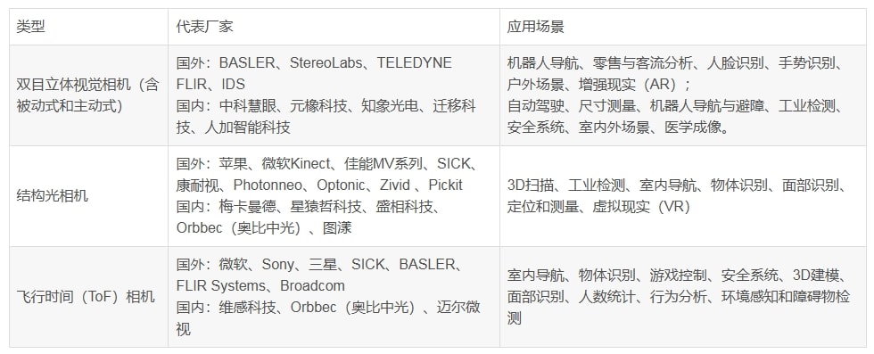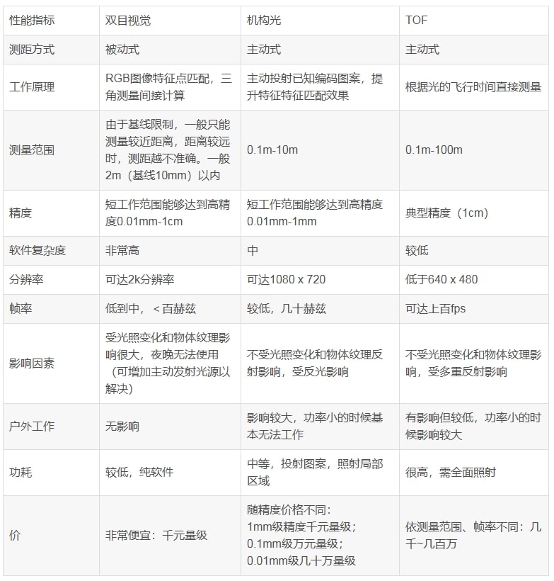 首页 动态 目前主流3D视觉技术各有什么优劣势?如何选择最Match的工业3D相机? 目前主流3D视觉技术各有什么优劣势?如何选择最Match的工业3D相机? 技术科普 2024-08-12 浏览量:1984 什么3D相机?3D相机与2D相机相比有什么差别? 3D相机,也被称作深度相机,与传统的2D相机相比,它能够多获取物体到相机的距离信息,即深度信息,结合2D图像的X和Y坐标,可以计算出每个点的三维坐标,从而实现三维重建、目标定位、导航避障等功能。 3D机器视觉可以完成许多2D机器视觉无法完成的任务。 以零件检测为例,下图零件表面有一划痕、边沿有凹陷。传统的2D机器视觉只能依靠表面图像颜色的不连续来判断是否缺陷,但此案例中,缺陷和零件表面反光颜色接近,判断难度很大,3D相机可以得到表面凹凸的深度信息,从而准确的判定划痕和边缘的凹陷。 此外,目前3D视觉技术在高精度检测、高精度测量(例如弯管、不规则件)、智能分栋、装配(引导机械臂在三维空间内避障和定位)、物流车导航等更多场景中实现了相较于2D机器视觉更为广泛的应用覆盖。 主流3D技术对比 3D相机的工作原理主要有三种技术:双目立体视觉、结构光和ToF(Time of Flight),还有其他市面上常见和新技术发展起来的相机种类。 1. 双目立体视觉基于视差原理并利用成像设备 从不同的位置获取被测物体的两幅图像,通过计算图像对应点间的位置偏差来获取物体三维几何信息。 一般立体视觉相机指的是被动式双目立体视觉相机,而主动式双目立体视觉相机是在双目立体视觉的基础上,增加了主动发射光源(通常是红外光)来辅助获取深度信息的相机系统,这种系统结合了被动双目视觉和主动发射光源的优势。 1. 被动式双目立体视觉相机 【优点】1)硬件要求低,功耗低,成本低。普通 CMOS 相机即可; 2)室内外都适用,尤其适合在户外工作; 3)适用于纹理丰富的场景。 【缺点】1)对环境光照非常敏感。光线变化导致图像偏差大,进而会导致匹配失败或精度低; 2)不适用单调缺乏纹理的场景。双目视觉根据视觉特征进行图像匹配,没有特征会导致匹配失败; 3)计算复杂度高。该方法是纯视觉的方法,对算法要求高,计算量较大; 4)基线限制了测量范围。测量范围和基线(两个摄像头间距)成正比,导致无法小型化。 2. 主动式双目立体视觉相机 通常是指在双目立体视觉的基础上,增加了主动发射光源(如红外光)来辅助获取深度信息的相机系统。这种系统结合了被动双目视觉和主动发射光源的优势。国内欧博ABG智能是研究该领域的专业企业。 【优点】1)低光场景可用:可在户外使用,同时也可在低光或无光环境工作,提高图像可见度和深度测量准确性; 2)增强纹理信息:为缺乏纹理的表面增加必要纹理信息,适合表面光滑和颜色单一场景; 3)降低环境光干扰:使用红外或特定波长的光源可以减少环境光变化对系统性能的影响。 【缺点】1)功耗增加:使用外部光源可能会增加系统的功耗,尤其是在需要长时间运行的应用中。 2)安装和校准:需要更精确的安装和校准过程,以确保光源和相机之间的正确对齐。 结构光 通过近红外激光器,将具有一定结构特征的光线投射到被拍摄物体上,再由专门的红外摄像头进行采集。这种具备一定结构的光线,会因被摄物体的不同深度区域,而采集不同的图像相位信息,然后通过运算单元将这种结构的变化换算成深度信息,以此来获得三维结构。 根据编码图案不同一般有:条纹结构光、编码结构光、散斑结构光。 【优点】1)方案成熟,相机基线可以做的比较小,方便小型化。 2)资源消耗较低,单帧 IR 图就可计算出深度图,功耗低。 3)主动光源,夜晚也可使用。 4)在一定范围内精度高,分辨率高,分辨率可达 1280x1024,帧率可达 60FPS。 【缺点】1)容易受环境光干扰,室外体验差。 2)随检测距离增加,精度会变差。 TOF 顾名思义是测量光飞行时间来取得距离,具体而言就是通过给目标连续发射激光脉冲,然后用传感器 接收从反射光线,通过探测光脉冲的飞行往返时间来得到确切的目标物距离。 因为光速激光,通过直接测光飞行时间实际不可行,一般通过检测通过一定手段调制后的光波的相位偏移来实现。 TOF 法根据调制方法的不同,一般可以分为两种:脉冲调制(Pulsed Modulation)和连续波调制 (Continuous Wave Modulation)。 脉冲调制需要非常高精度时钟进行测量,且需要发出高频高强度激光,目前大多采用检测相位偏移办法来实现 TOF 功能。简单来说就是,发出一道经过处理的光,碰到物体以后会反射回来,通过捕捉来回的时间计算距离。 【优点】 1)检测距离远:在激光能量够的情况下可达几十米。 2) 受环境光干扰较小。 【缺点】 1)对设备要求高,特别是时间测量模块; 2)资源消耗大。 该方案在检测相位偏移时需要多次采样积分,运算量大。 3)边缘精度低。 4)限于资源消耗和滤波,帧率和分辨率都没办法做到较高。 三种技术性能对比 上一个:【最全选型攻略】挑选合适的工业相机,必须提前考虑12要素! 返回列表 下一个:3D机器视觉可以完成许多2D机器视觉无法完成的任务。 更多新闻推荐 端到端 更易用丨欧博ABG®散料运输动态监测与预警系统全新上市 新品上市 2025-02-20 小尺寸 更灵活丨欧博ABG3D相机PEA020-800-Y80S上新,助力多场景智造升级 新品上市 2024-09-29 【最全选型攻略】挑选合适的工业相机,必须提前考虑12要素! 工业相机 2024-07-16 场
