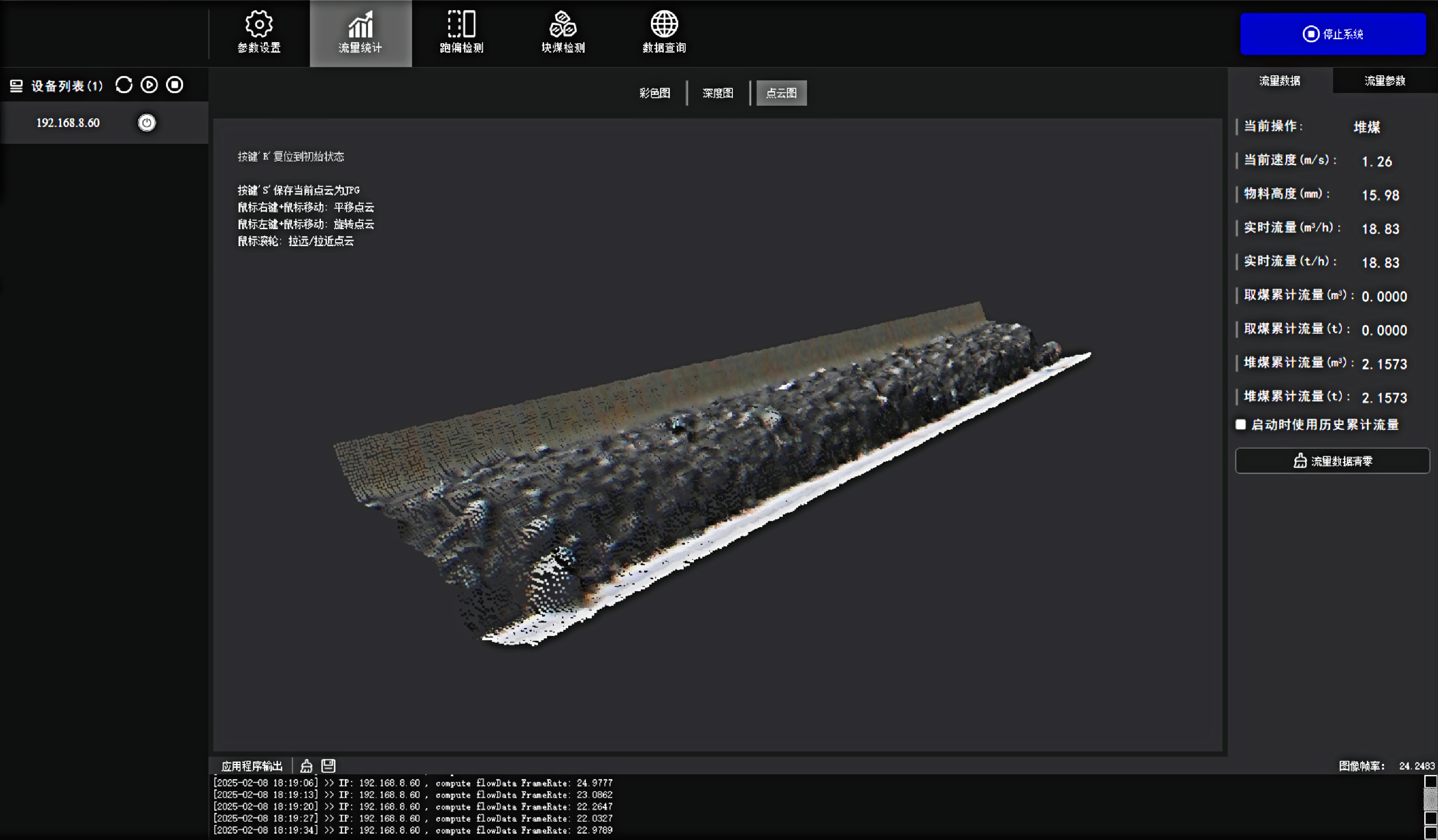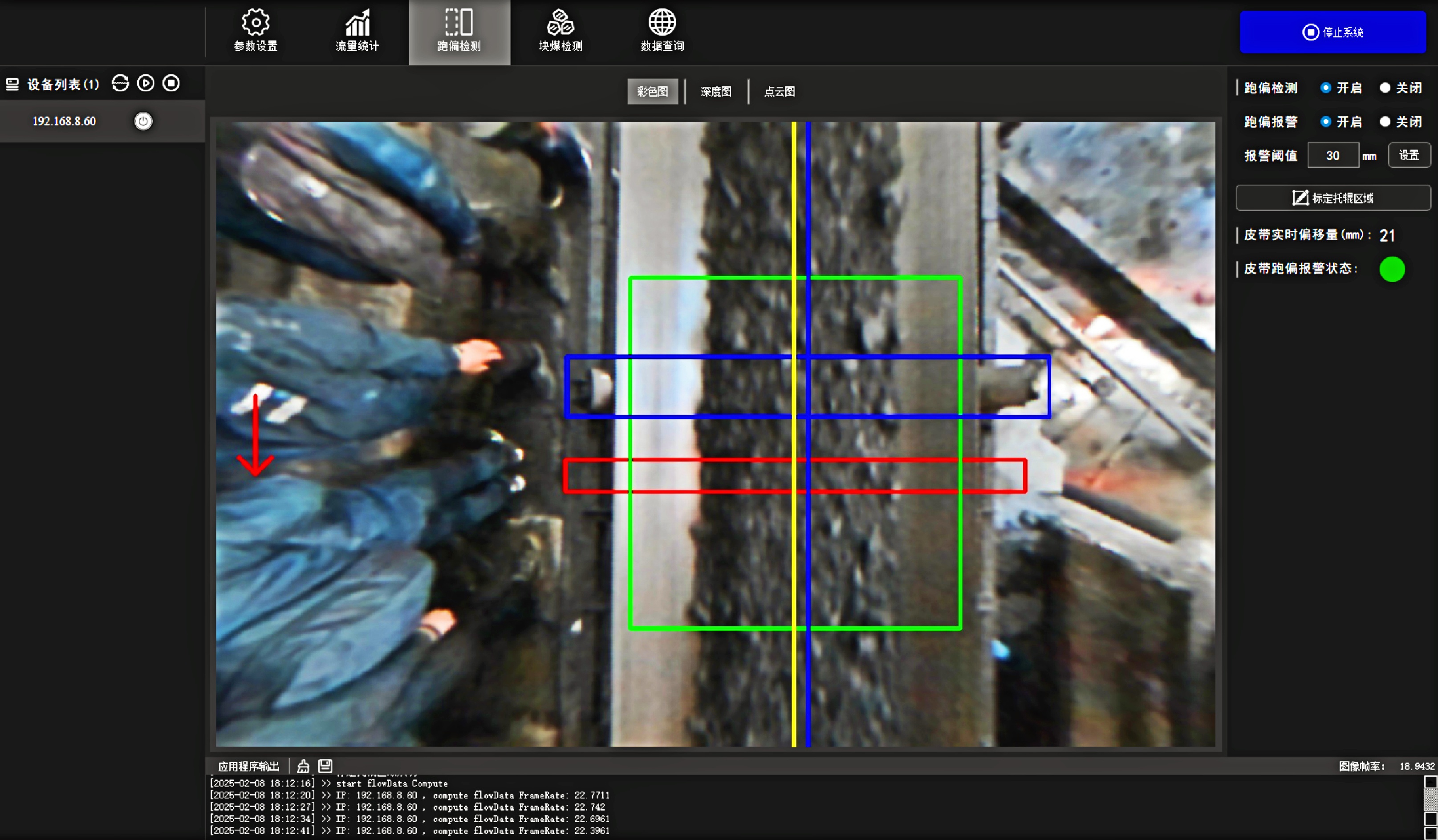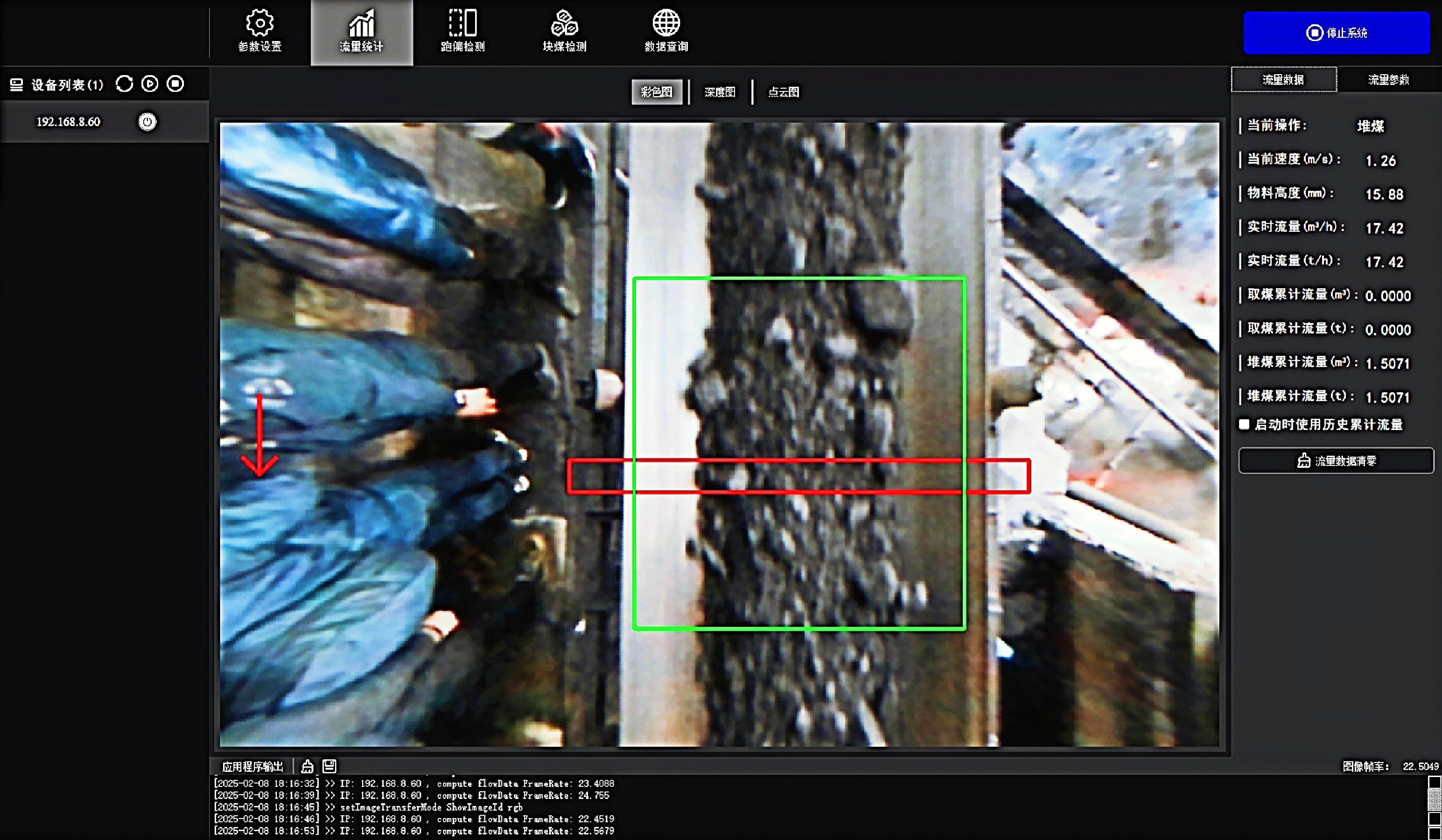 料型料流监测一体机系统 欧博ABG®智能料型料流监测系统由智能煤流监测一体机搭配监测平台构成,实时监测输送带工业散料流量,包含煤矿、砂石骨料、粮食等 首页 产品 3D相机 欧博ABG® 料型料流监测一体机 RBGD智能一体机 欧博ABG® 料型料流监测一体机 系统由智能料流监测一体机搭载监测平台构成,由稳定的底层硬件、嵌入式算法软件和自动化监测管理平台实现服务,实时采集高精度煤流RGBD数据,完成场景的实时三维彩色点云重建,对高速运动的皮带输送机进行精细化管理调控→应用场景: 煤矿检测系统精细化管理 定制解决方案 应用场景 煤流统计支持皮带速度6m/s,环境适应强,部署简单,无需改造现场环境即可安装块煤检测通过三维点云数据分析,能够对块煤的尺寸进行精确测量,准确计算出块煤的长、宽、高等尺寸数据输送带自动测速自动测量高速运动中的输送带速度,确保及时发现异常波动输送带跑偏检测通过获取的输送带三维尺寸位移信息,对皮带左右边缘位置与阈值比较并判断是否偏离正常轨道,同时计算跑偏幅度和方向煤流高度检测对煤流高度精准检测,能够有效管理煤流的分布、运输量、堆积情况 产品特点 测量误差<5%在高速动态检测上,测量精度可达毫米级,测量结果与实际煤量误差小于5%工业级硬件设计采用IP65防护等级和工业级防尘防水,可在高粉尘、大温差的情况下稳定运行室内暗光环境适用在室内、地下、夜晚能稳定测量,无需补光部署简单,安装便捷,支持二次开发出厂相机内参标定,可快速部署集成,无需改变现场环境即可安装,实施速度快,调试简单,系统易于维护接口丰富,数据直传丰富的系统对接接口,可直接对接PLC、变频器、服务器,快速完成精细化皮带控制大景深、大视野,多范围应用测量皮带宽度达2.4m;煤堆高度达1.5m边缘计算架构,实时测量使用边缘计算架构,将多种智能算法在边缘端实现,保证数据实时传输 性能参数 RGBD智能一体机型号VEA020-800-X180参数技术原理主动式双目基线长度180mm测量范围0.9m~2.5mZ向精度1m:≤1.3mm帧率25fps数据类型深度图、彩色图、红外图、点云图分辨率彩色图像:1280x800/640x400 ; 深度图像:1280x800/640x400像素形式彩色图: 8位三通道图 ;深度图:16位单通道图彩色视场角Horizontal 90°,Vertical 64°深色视场角Horizontal 90°,Vertical 64°RGBD同步对齐支持曝光类型全局曝光曝光控制自动/手动流量统计技术参数推荐安装高度1.2m~1.5m覆盖输送带范围0~3m支持输送带速度0~6m/s,推荐0~4m/s流量统计精度误差<5%物料高度测量支持,精度毫米级自动测速支持,安装位置需要具备照明条件实时流量统计 支持,统计周期支持配置跑偏检测支持,跑偏精度可达毫米级块煤检测 支持,支持块煤参数定义数据存储支持5年以上体积结果化数据存储数据查询支持按小时,天和月等维度查询实时视频支持rtsp协议彩色图像拉流点云数据支持彩色点云拼接数据输出协议支持TCP硬件参数数据传输接口千兆以太网相机供电要求12V~24V DC功耗18w结构尺寸(mm)270mm x 80mm x 44mm重量(g)1200g防护等级IP65温度工作温度:-25 ~50°C ;存储温度:-30 ~80°C湿度20% ~ 85%散热方式被动散热软件支持开发环境Windows/Linux数据协议TCP数据查看流量统计客户端 点云图 资料下载 欧博ABG® 煤流体积测量输送带监测管理平台 产品资料下载 请填写此表格并点击提交后,程序会自动下载文件 *合作意向 请选择 商务合作 媒体合作 投资者合作 *电话 *姓名 公司 行业 职位 邮箱 地址 您的留言 提交并下载资料 您也可以拨打欧博ABG的客服电话:010-81046658 联系欧博ABG